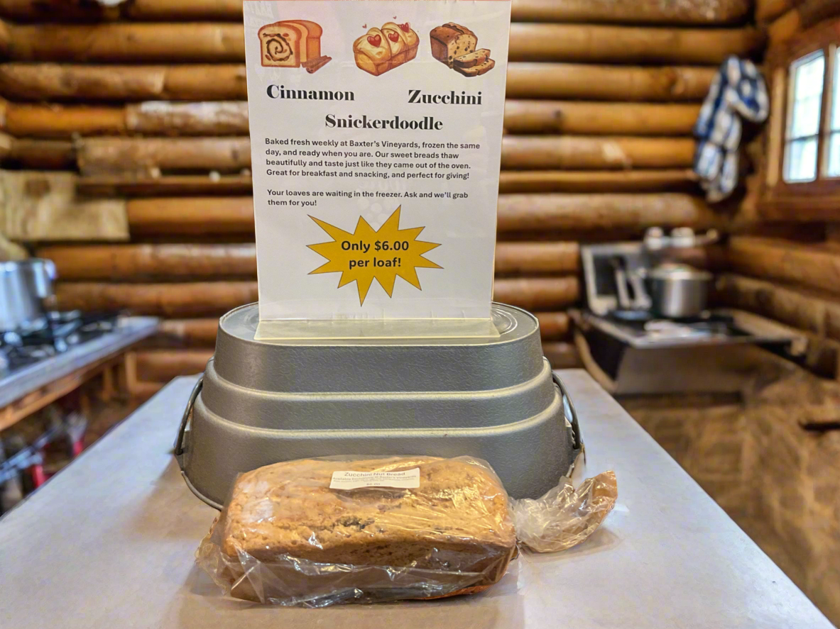 Our famous homemade Snickerdoodle, Zucchini, and Cinnamon Breads. Baked fresh weekly at Baxter’s Vineyards, frozen the same day, and ready when you are. Our sweet breads thaw beautifully and taste just like they came out of the oven. Great for breakfast and snacking, and perfect for giving!