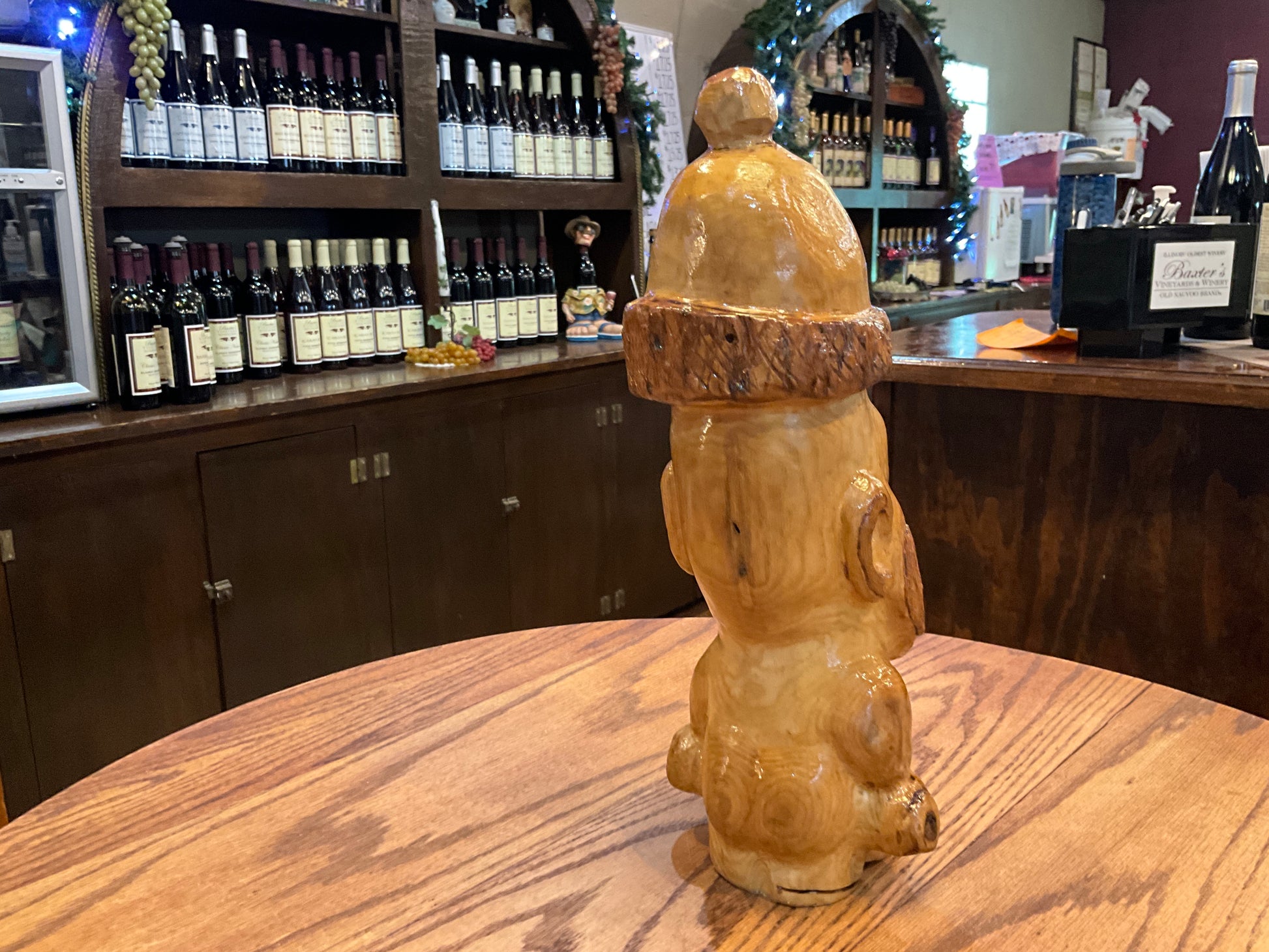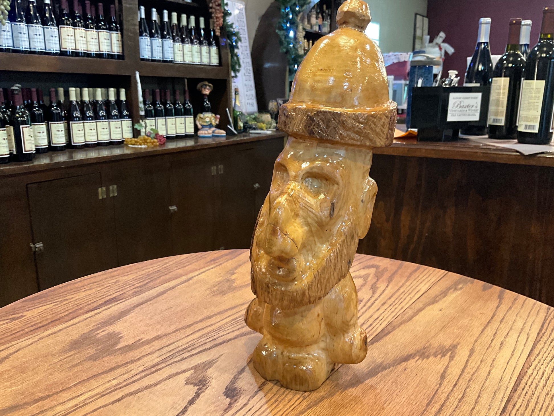 Large hand-carved wooden gnome with a semi-gloss varnish. With his scarred nose and lack of clothes, he’s looking for trouble!