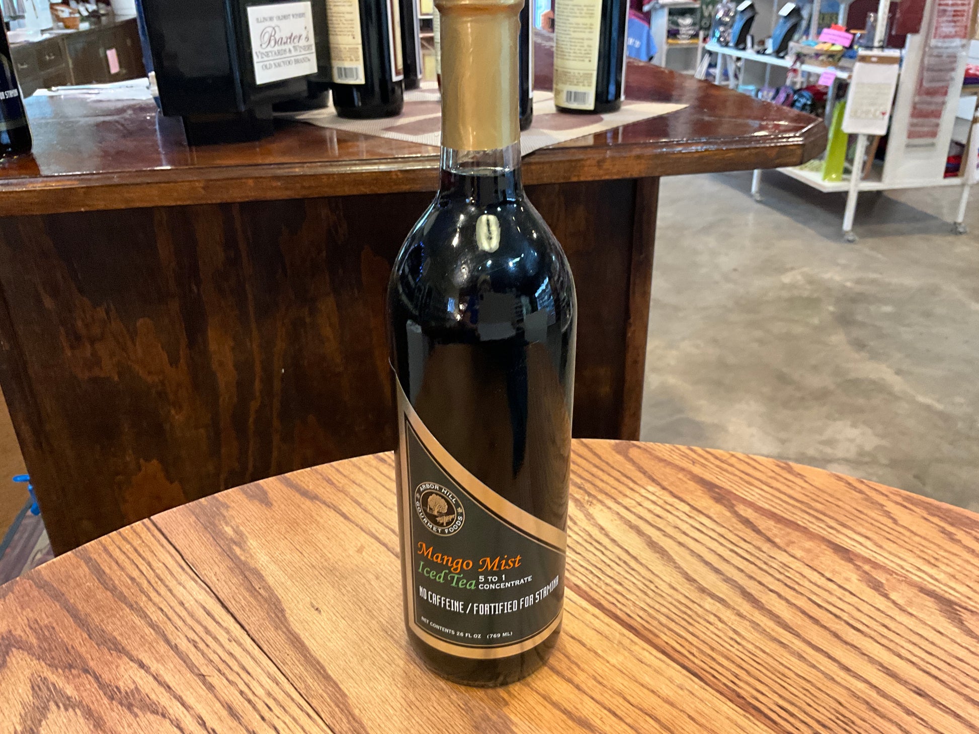 Arbor Hill Mango Mist Iced Tea Concentrate (5 to 1). Caffeine-free, fortified for stamina. Each serving contains 100% daily value of Vitamin C, Niacin, Vitamin B6, and Vitamin B12. Each bottle makes 19 servings.