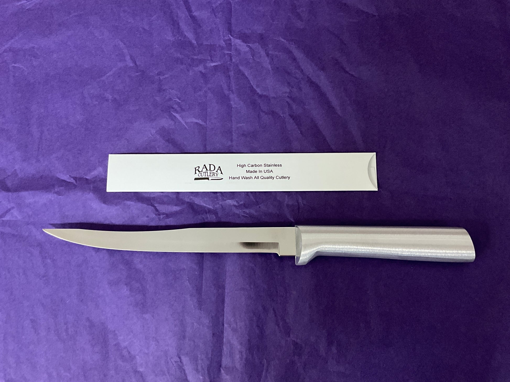 Rada Carver/Boner Knife with Silver Handle has a 6 5/8” blade and is 11” overall. The flexible blade on this knife expertly carves around bones in all kinds of meat, removes skin from fish, and cuts fat from brisket. The long, razor-sharp blade flexes as you cut for maximum efficiency.