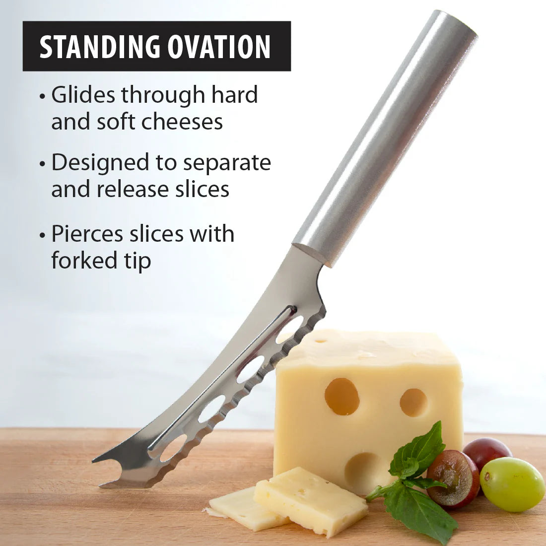 Rada Cheese Knife (R139) has a 5 1/4” blade and is 9 5/8” overall. Easily cuts hard and soft cheeses… great for sausage too! Special design separates individual slices, and the forked end makes serving a breeze.