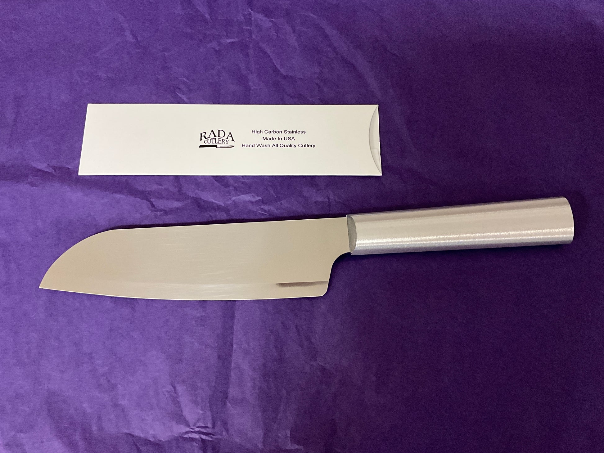 Rada Cook’s Knife with a silver handle (R134) is 6 1/4” blade and 10 7/8” overall. Effortlessly minces garlic, dices vegetables, chops fruits, cuts meat, slices desserts, and so much more. A versatile easy-to-control knife.