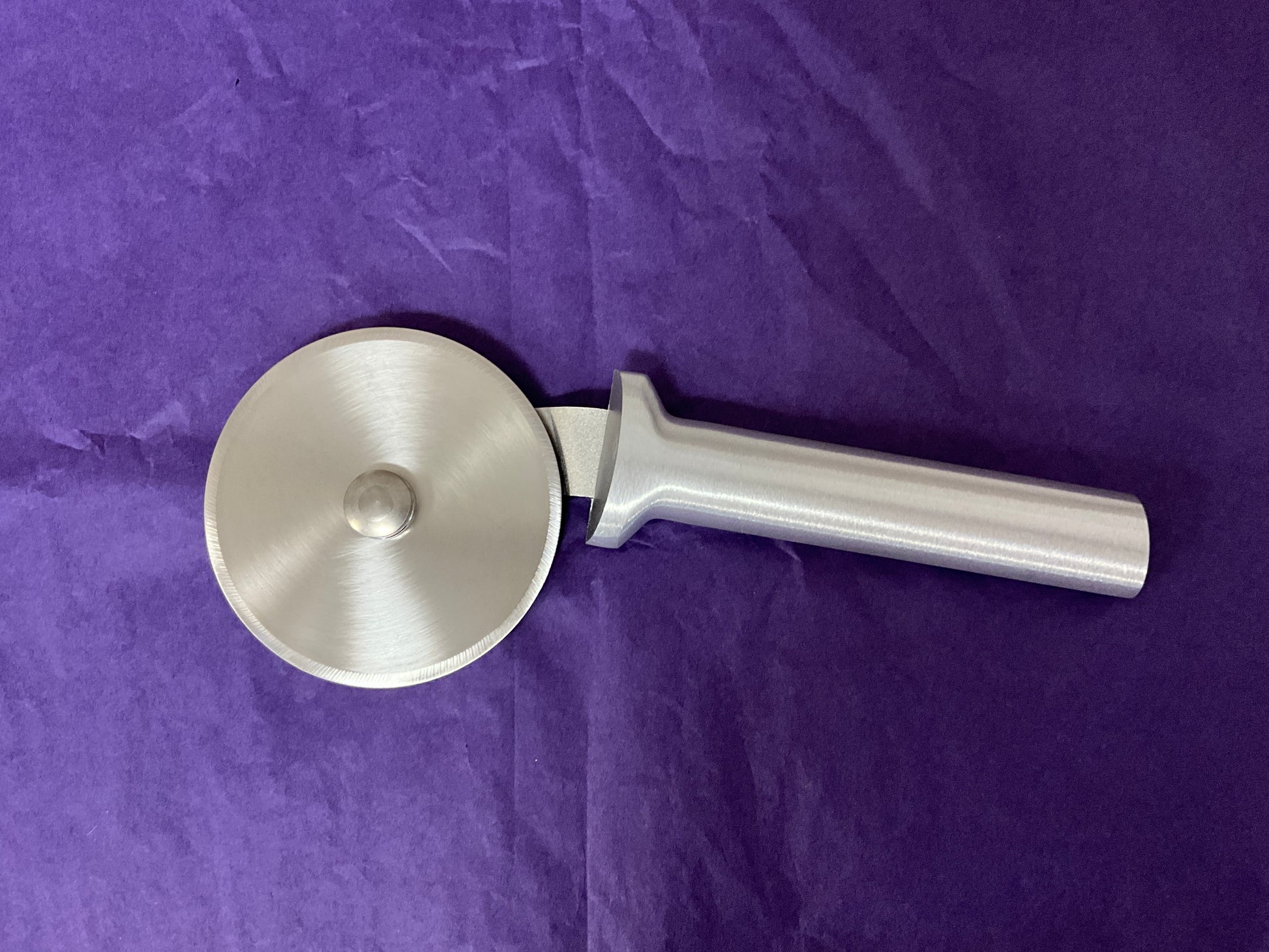 Rada Pizza Cutter (R121) has a 3” wheel and is 7 5/8” overall. Easily zips through thin or deep-dish pizza. Great for slicing quesadillas and biscuit dough too.