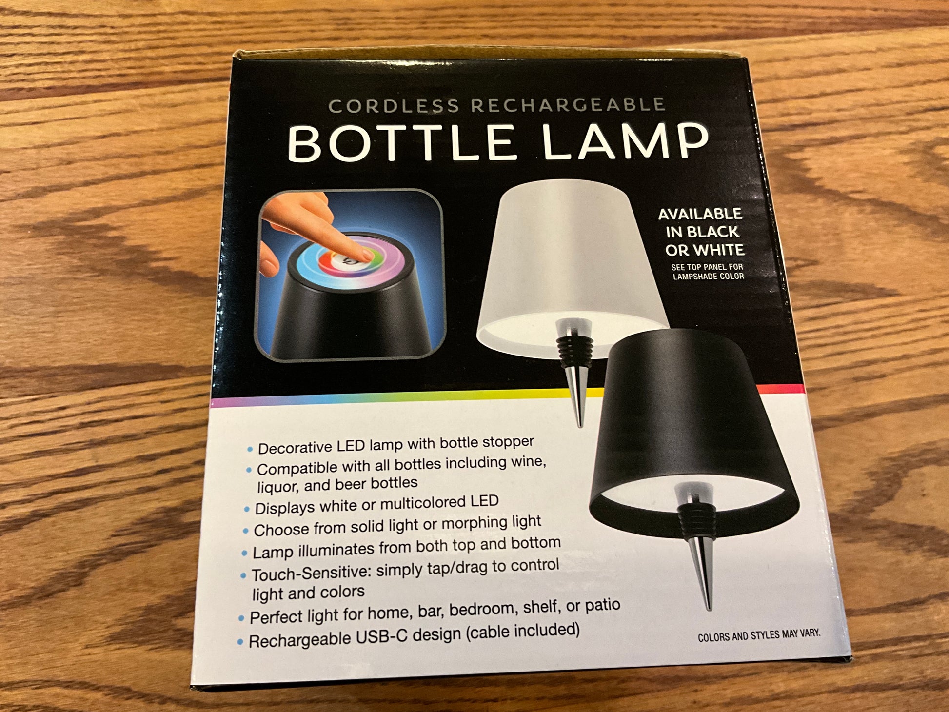 Cordless rechargeable Bottle Lamp with 5 Unique Lighting Modes: Warm White, Cool White, Neutral White, Solid Color, Color Morph. Fits any bottle! A great addition to your bar or as a night light in any room.